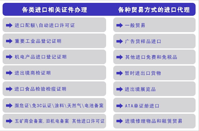 1、代理进口, 包括:进口付汇;进口办证等相关服务。